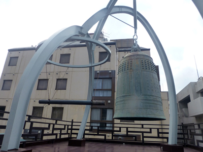 門の上には平和の鐘があった。つきたい人は何時に集まってくださいということ。 |