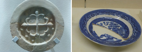 上 展示室があった。左は、教会の瓦。右は代官の屋敷になってからの皿。左 桜町小学校。向こうの校舎の1階は資料館。資料館は小学校と一体で建設されたようだ。 |