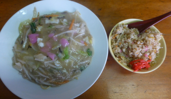 5人すわれるカウンターだけの店だ。色紙が多く貼ってあり、仲代達矢さんのものもあった。 下 皿うどん(太麺)セット。セットは、焼きめしがついてくる。 |