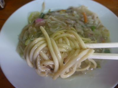 太麺の皿うどんでは、麺が柔らかいものを使う。 |