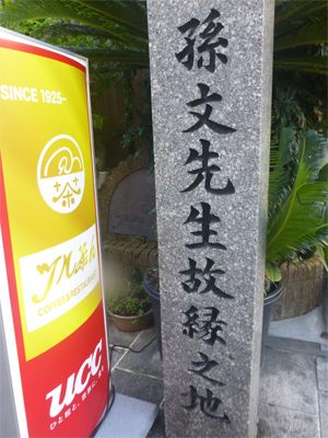 玄関横の「ツル茶ん」の看板に並んで孫文ゆかりの地の碑がたつ。この地には鈴木天限の東洋日の出新聞社があった。鈴木は孫文の支援者で、長崎を9回訪問した孫文は決まってこの地を訪れたという。 ツル茶んの開業は1925(大正14)年。一方、鈴木も孫文も1925年没で、新聞社は1934年の廃業で、ツル茶んと新聞社の敷地が重なるかは不明。 |