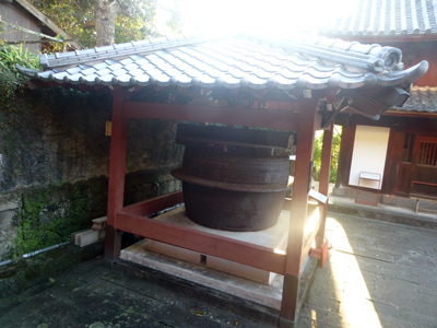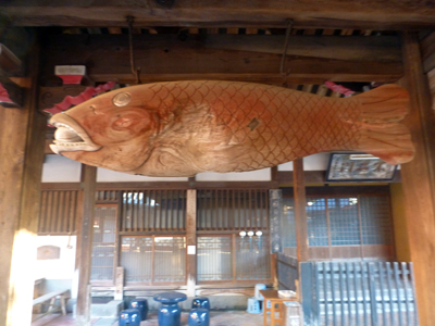 廊下にかかる巨大な木魚。大人の人体と同じくらい。お腹の部分をたたくので、かなりすり減っているようだ。 |