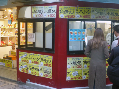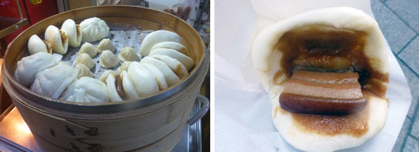 別の店の店頭でもせいろを置いて、何種類か売っていた。下 左はせいろの中、右は買った煮豚まんじゅう(刈包)。 |