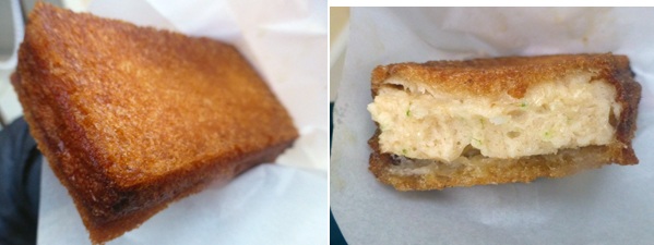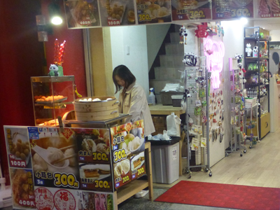 中華街では、土産物屋が店頭でスナックを売っている場合もある。そうした店で少し食べてみる。下 「ハトシ」をいただいた。食パンに魚の練り物を入れた揚げたもの。 12分待ってくださいということで、しばらく店頭で待った。 |