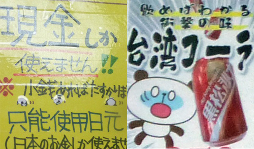 左 現金のみという案内。右 台湾の黒松沙士も売られていた。 |