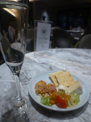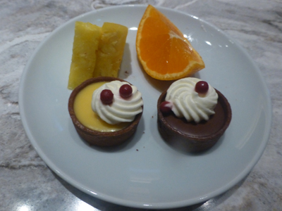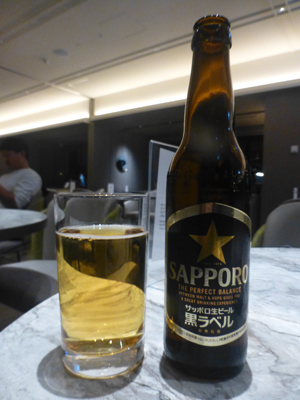 上左 宿に戻り、コーディアルタイム中のラウンジに向かった。冷たい料理少々とスパークリングワイン。上右 ビール。黒ラベル瓶ビール。 左 デザート。 |