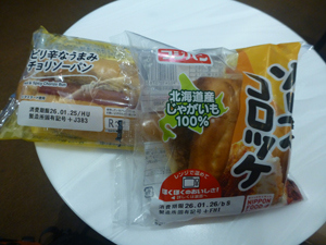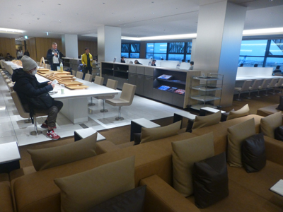 ANAラウンジへ。下左 5時すぎに出発したため、朝食はとってない。 普段はラウンジでは朝ビールだが、今回はコーヒー。 下右 前日、自宅での朝食用に買ったパンを食べる。 |