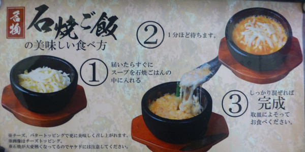 店内。下 石焼ご飯を注文し、麺のスープを入れて食べると美味しいらしいので、麺とともに注文。 麺は中辛で、こんにゃく麺にした。中華麺、うどんとともに、こんにゃく麺が選べるのだ。 |
