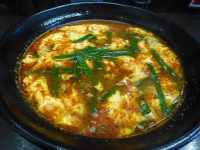 辛麺。大盛にしても料金は同じで、大盛にしてもらった。唐辛子で辛く、中辛でも、汗がたらたらでてきた。卵とじが入っていて、味にまろやかさがある。上には、にらがのっている。 |