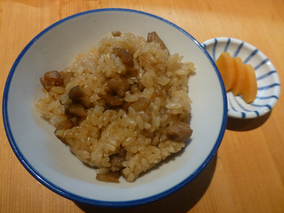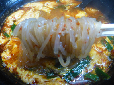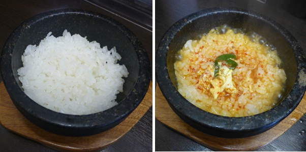 こんにゃく麺。"糸こんにゃく"とよんでいるものだ。下 左、石焼ご飯 右 スープをかけた状態。麺も美味しかったが、ご飯はもっと美味しかった。 |