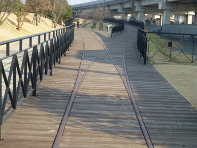 大分駅付近ではJR線路は高架になっているが、地平の線路跡を利用して「ボードウォーク」という細長い公園があった。 |