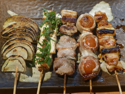 串焼き各種。左から、たまねぎ、鶏もも、豚バラ、トマトベーコン巻、ねぎま。 |