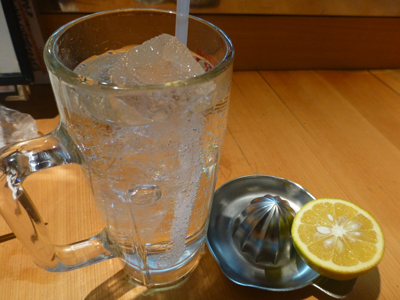 かぼすサワー。自分でかぼすを絞って入れる。 |