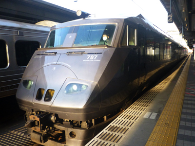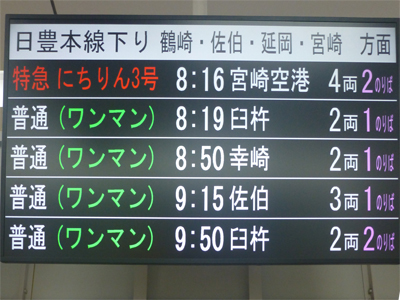 8時16分発、宮崎空港行き「にちりん3号」に乗車。前日ネットで、"九州ネットきっぷ"で購入しておいた。激安ではないが、指定席に自由席料金で乗れるのがいい。 |