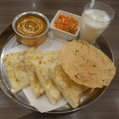 セットにした。日替わりカレーはシーフードカレーで中辛にした。 サラダ、飲物はラッシーにした。 ガーリックナンかバターナンが選べて、ガーリックにした。せんべいのようなのはパパト。 |