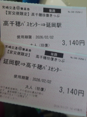 延岡駅に戻り、バス会社で高千穂往復の割引切符を買う。往復で3140円。 |