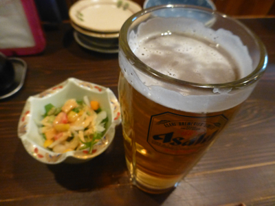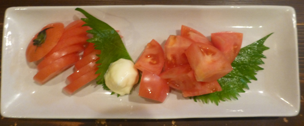 生ビールとお通し。下 高千穂産トマト。 ただのトマトなのだが、とても美味しかった。 |