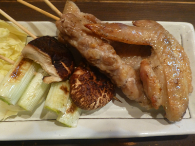 串焼き。ねぎ、しいたけ、豚バラ、手羽先。材料は高千穂産が多かった。 |