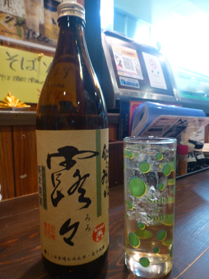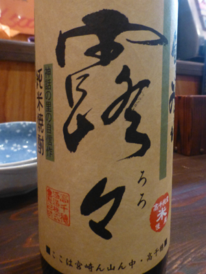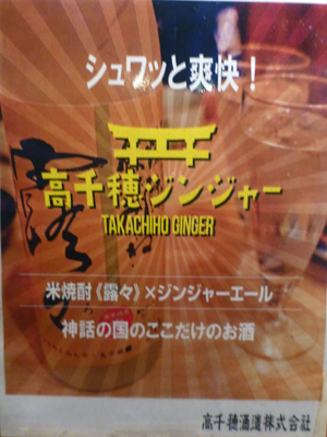 「高千穂ジンジャー」なる飲物があった。高千穂神社にかけた名前で面白そう。下左 米焼酎「露々」をジンジャエールで割ったもののようだ。 下右 「露々」は高千穂町の高千穂酒造製。 |