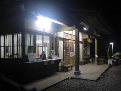 上 足元の明かりがあるものの暗い夜道を夜神楽の会場の高千穂神社に向かう。左 19時開始の1、2分前に会場に到着。1000円払って中へ。 |