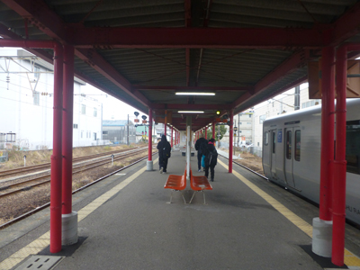 3分で宮崎神宮駅に着く。前夜もここから乗車したのだが、ホームの柱が赤く塗られていることなど、前夜は暗くて気づかなかった。 |