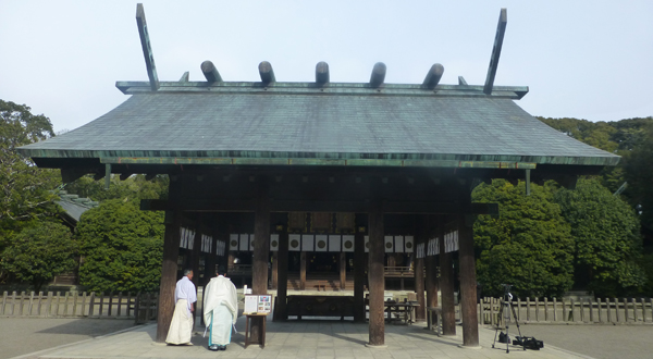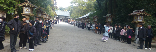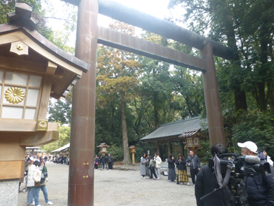 そして宮崎神宮へ。参道にたくさんの人が並び、カメラをかかえた報道陣も多数。下 参道の両側に並ぶ人たちの間を歩いて拝殿に向かったが、何やら恥ずかしい。この時点でも何があるのかわからなかった。 |