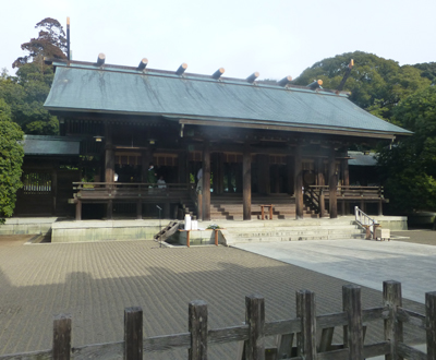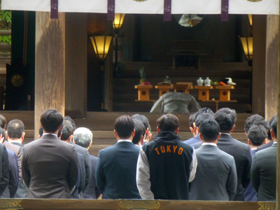 上 拝殿で参拝。左 拝殿の奥は参拝者は入れないが、かなり離れて本殿がある。 参道に戻ると、ようやく、巨人の選手たちが必勝祈願のためにやってくるんだと理解した。 この日は1月31日。翌2月1日から、プロ野球のキャンプがあり、宮崎では巨人を含め多くの球団がキャンプすること自体は知っていた。でも、旅行計画を立てる際には、キャンプは意識外で、前日に巨人選手が自分の行く宮崎神宮へ同時刻に必勝祈願するなんて思いもよらなかった。 |