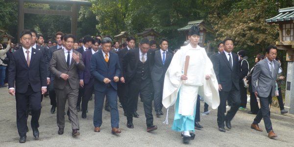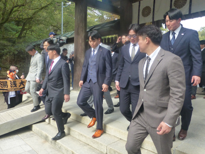 参道の途中の祠でも選手たちが祈願。下 神職に先導され社殿へ歩く選手たち。大柄で迫力がある。 |