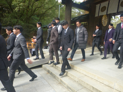 望遠を最大限にしてみると、選手たちは、拝殿と本殿の間に入って祈願している。 |