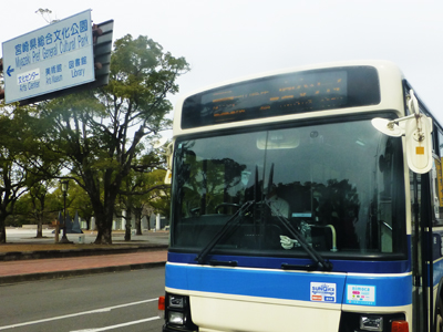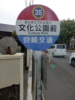 宮崎神宮前駅まで戻り、JRで南宮崎に行く計画だったが、美術館の前に「文化公園前」バス停があり、10分ほど待てば、南宮崎駅に近い宮交シティ行きのバスがあるので、バスで移動することにした。 |