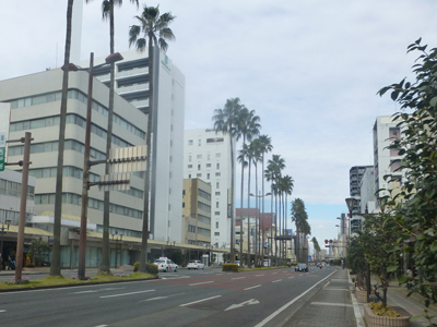 宮崎市のメインストリートの橘通り。この付近はオフィスビルが多いが、北に行くと、次第に繁華街になっていった。 |