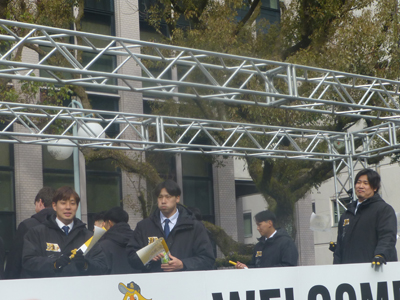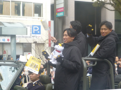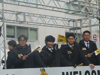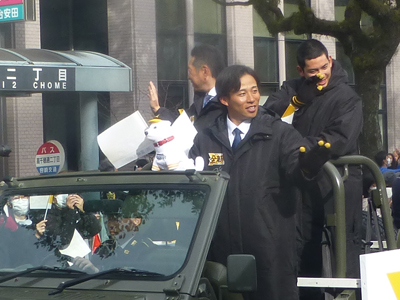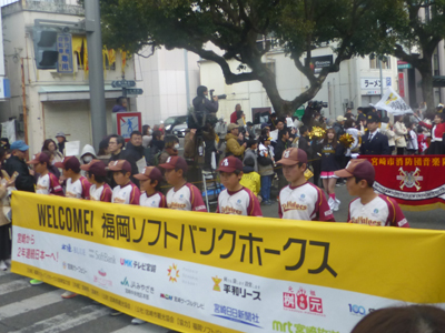 列車の発車時間が近づいたのだが、1便だけ遅らせて、最後までパレードを見られた。巨人の宮崎神宮参拝もソフトバンクの歓迎パレードも本当にラッキーだった。 |