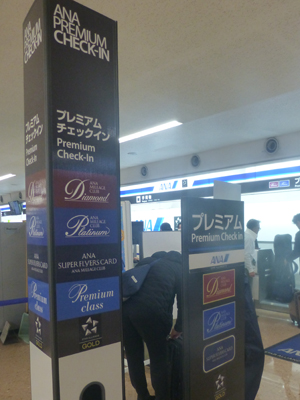 今や、ANAもJALもセルフでの荷物預けが当たり前になったが、SFCのおかげで有人のプレミアムチェックインを利用できてよかった。行きの大分便と同じく、株優でとっておいた。 |