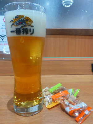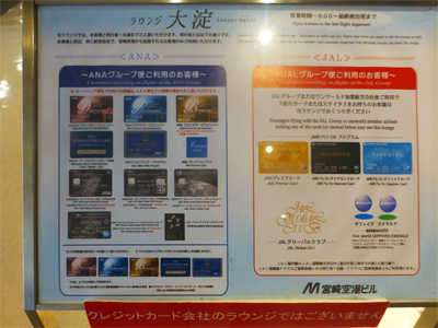 パレードのために少し遅れたので、土産物売場には行かなかった。前日までに買っておいてよかった。ラウンジ大淀。ANAとJALの共同ラウンジ。写真では見えにくいが、下の赤いところに「クレジットカードのラウンジではございません」と書いてある。 |