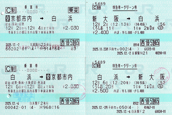 下 切符は、株優を使いネット予約していたが、白浜駅切符売場で受取るとともに、乗車券を京都市内行きに変更。(ネット予約では、特急券と同じ新大阪までしか予約できないので) 行きも、ネット予約していた切符を京都駅で受取るとともに、乗車券は京都市内発に変更した。 JRの切符は発券後1回だけだが変更できる。(激安で販売される、企画商品の切符は変更不可。例 JR東海のこだま利用で安くなる切符) 切符は、左上 行き乗車券。右上 行き特急券・グリーン券。左下 帰り乗車券。右下 帰り特急券・グリーン券。 |