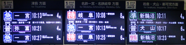 上 名鉄名古屋駅に行き、1駅だけ乗車。北行だけでも、弥富方面・岐阜方面・犬山方面にわけて案内されている。下車する栄生(さこう)は、急行・準急は停車する。左 10時11分発の準急・新鵜沼行きに乗車。 |
