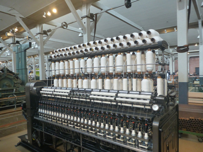 1955年製のリング紡績機。紡績の歴史では重要なもので、実際はこれを何台もつないで使っていたようだ。 |