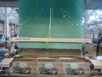 2023年製の織機で写真どおりの柄の布を織れる。自動車柄のタオルをつくっている実演中。 |