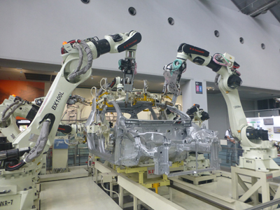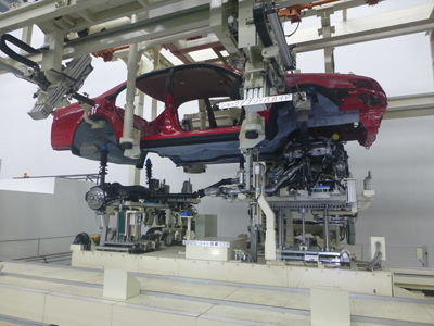 ボデーにエンジンとシャーシを自動でとりつける機械。 |