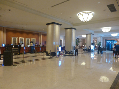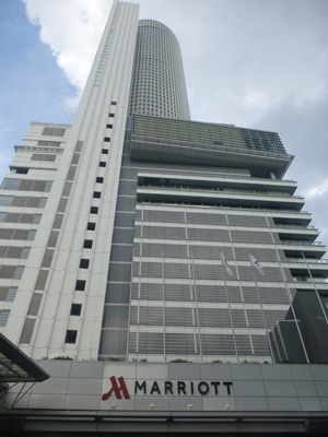 いずれのビルも15階でエレベータが乗り換えになっている。15階で降りて、フロントに向かう前に、3つのタワー共通の通路に出てみた。写真は、15階通路に面した、マリオットアソシアの玄関。 |