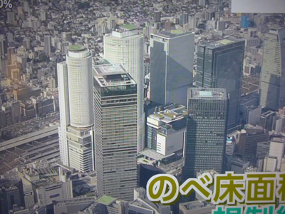 (NHKニュースの場面を拝借)7つある高層ビルのうち、左上側の3つが15階建ての駅ビルの上に建っている。左端の細い円柱なのがマリオットアソシアホテル。 |