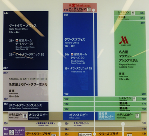 駅ビルの上に3つのタワーがあり、15階までは共通。上は、右がマリオットアソシア、中がオフィス、左はJRゲートタワーホテルとオフィス。「アソシア」はJR東海ホテルズのブランド。東海道新幹線沿線で展開している。一方、JRゲートタワーホテルもJR東海ホテルズ経営で、室料からみて高級ビジネスホテルといった感じ。 |