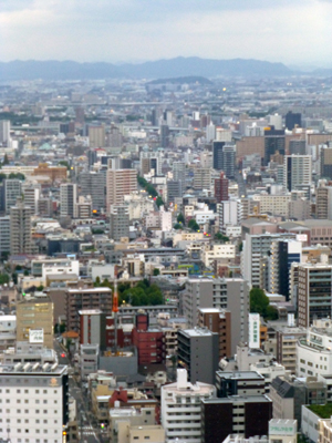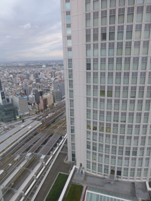今回の旅では、名古屋駅ビルの中にある「名古屋マリオットアソシアホテル」に5泊。直下から撮影した写真だが、1〜14階はオフィスなど。15以上がホテル。黒っぽいのは15、16階で、15がフロントなど、16が宴会場になっている。 円柱であるのが17〜52階部分で、36がラウンジ、51が宴会場、52がレストランなどで、残りが客室階。 |