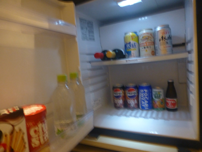 冷蔵庫内。ウェルカムギフトで3本無料になった。5泊なので、3日で赤白ワインとビールを各1本いただいた。 |