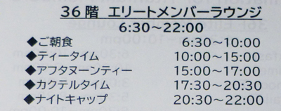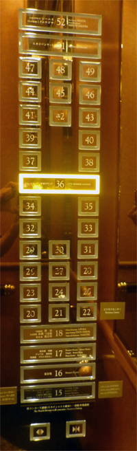 ラウンジは36階にある。その上の37〜49階は客室、50は抜けていて、51は宴会場、52はレストランのようだ。 |