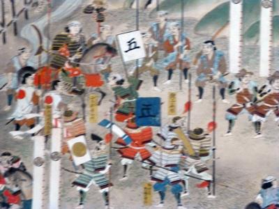 城をイメージした建築だ。館に入る。下左 初代尾張藩主・徳川義直(家康の九男)が着用した甲冑。 下右 長久手の戦での家康。白の五の左。 |