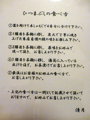 上ひつまぶしを注文。ひつまぶしの食べ方を確認しておく。以前入店した店と同じだ。 1 4つに分ける 2 そのままいただく 3 薬味をのせていただく 4 出汁をかけていただく 5 残りは好きな食べ方で |