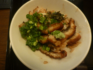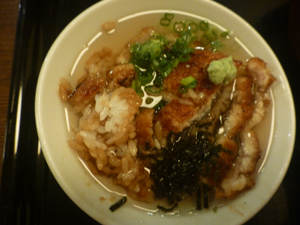 大きなうなぎが2枚入っている。下左 薬味をかけていただく。 下右 薬味をかけた上に出汁をかけていただく。 |