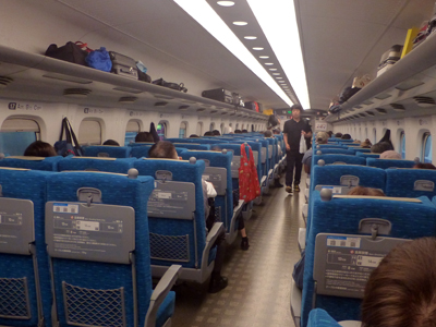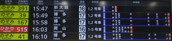 上 なんとか出発15分前に駅に入れた。16時3分発「ひかり515」に乗車する。教訓だが、16時にレイトチェックアウトできるにしても、チェックインの始まる15時までにチェックアウトするほうが無難だ。 左 乗車した「ひかり515」。 |