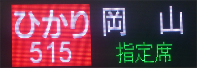 行先表示。この「ひかり」は京都から各駅停車になるタイプの「ひかり」なので選んだ。 |